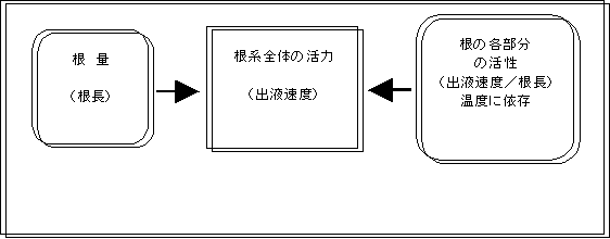 ここでは、個体単位での根系の活力の指標として出液速度を調査し、根量の指標となる根長、および、生理活性に強い影響を及ぼす温度の2つの要因により、出液速度がどのように規定されているかを検討する(下図)。