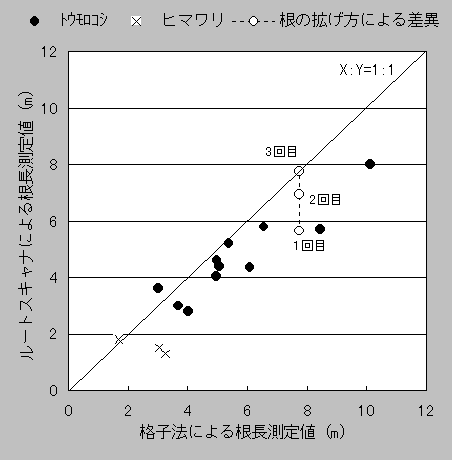 ルートスキャナによる測定値は、格子法による測定値と比例しているが、やや過小評価の傾向がある。格子法では人間の目が分枝根も正確に把握できるのに対して、ルートスキャナでは充分に根を拡げておかないと、センサーが重なり合った分枝根を判別できないものと考えられる。